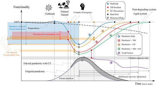 Figure 5 qualitatively illustrates a few potential scenarios (some with rare probability) that could happen within a healthcare system. Again, our primary metric is loss of life, which should be controlled (i.e., reduced) during a pandemic. Similar scenarios can be designed for social and economic aspects, which are ignored in this paper. One may note that combining these three hazard sources with different nature is a challenging task because their spatio-temporal domains are different. While most crises or disasters are constrained within a relatively limited space and time, pandemics persist and reverberate for months or even years [65]. Establishing our three main hazard sources as a NH, pandemic, and CEs, the following five scenarios can be discussed, see Figure 5: