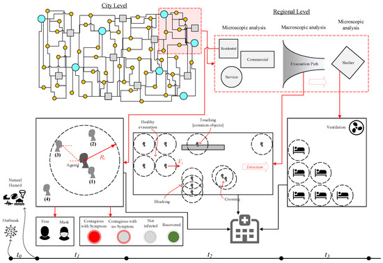 Evacuation and sheltering in pandemic era after a natural hazard; in city level figure (top left), the circles and squares present different types of buildings; the timeline axis presents the pandemic era before natural hazard occurrence, , during staying inside a confined place, , during evacuation, , and during sheltering, .