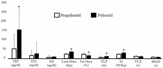 Comparison according to the stage of sexual maturation. * Statistically significant. TRT = Testosterone. EST = Estradiol. GH = Growth Hormone. ULP = Upper limbs power. SJ = Squat Jump. ULS = Upper limb speed. BScD = Body speed with change of direction.