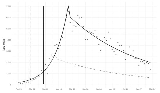 where T is the time elapsed since the start of the study; T2 is the time elapsed since the implementation of lockdown (set to 0 before the lockdown); X is a dummy variable indicating the pre-lockdown period (coded 0) or the post-lockdown period (coded 1); Y is the logarithm of the number of new cases at time T; α is the intercept of the model; β1 represents the trend of new cases before the lockdown; β2 is the step change following the lockdown; β3 is the slope change following the lockdown; and et is the error term of the model. Preliminary analysis of the data suggested that no adjustment was required for autocorrelation of the error terms et. We also assumed a two-week lag between the implementation of the lockdown (March 9th) and the start of its effects (March 23rd), to take into account the COVID-19 incubation period and the diagnostic delay after symptoms onset [].