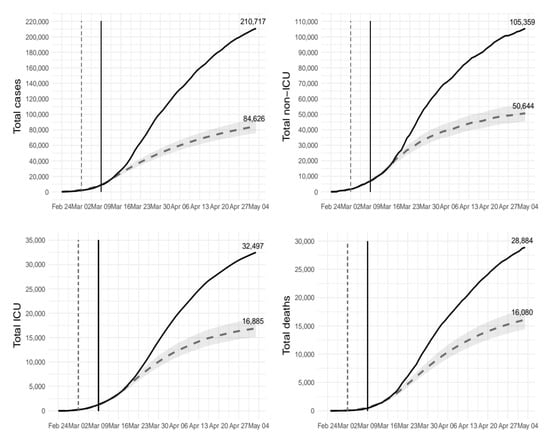 Moreover, the maximum hospital demand would have been much lower under the counterfactual scenario. The peak number of non-ICU admissions would have been 14,336 rather than 29,010 (−51%; 95% CI: −45% to −56%). A similar reduction would be expected for ICU admissions as well (2300 vs. 4068 beds; −44%, 95%CI: −38% to −49%).