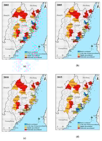 - In terms of spatial distribution, the CCD has a “center-periphery” pattern. That is, the closer to the three central cities of Fuzhou, Xiamen, and Sanming it is, the higher the coordination degree it has; vice versa.
