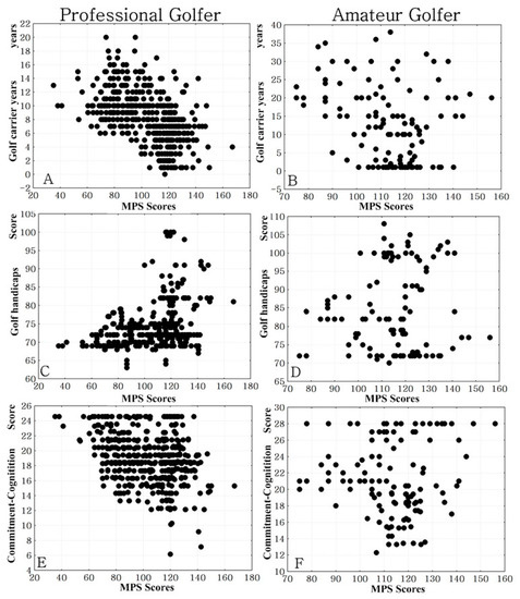 Scatter plot between perfectionism, commitment, golf handicap, and carrier years. MPS: Multidimensional Perfectionism Scale; ES: effect size: (A) controlling for age and training time, the partial correlations between golf career length (years) and MPS total scores in professional golfers, r = −0.38, p < 0.01, −0.472 < 95% CI < −0.323, moderate ES; (B) controlling for age and training time, the partial correlations between golf career length (years) and MPS total scores in amateur golfers, r = −0.53, p < 0.01, −0.642 < 95% CI < −0.465, large ES; (C) controlling for age, golf handicap, and training time, the partial correlations between golf handicap and MPS total scores in professional golfers, r = 0.33, p < 0.01, 0.281 < 95% CI < 0.435, moderate ES; (D) controlling for age and training time, the partial correlations between golf handicap and MPS total scores in amateur golfers, r = 0.12, p = 0.02, 0.002 < 95% CI < 0.253, small ES; (E) controlling for age, golf handicap, and training time, the partial correlations between commitment-Cognition scores and MPS total scores in professional golfers, r = −0.30, p < 0.01, −0.388 < 95% CI < −0.228, moderate ES; and (F) controlling for age, golf handicap, and training time, the partial correlations between commitment-Cognition scores and MPS total scores in amateur golfers, r = 0.07, p = 0.61, −0.108 < 95% CI < 0.1485, small ES.