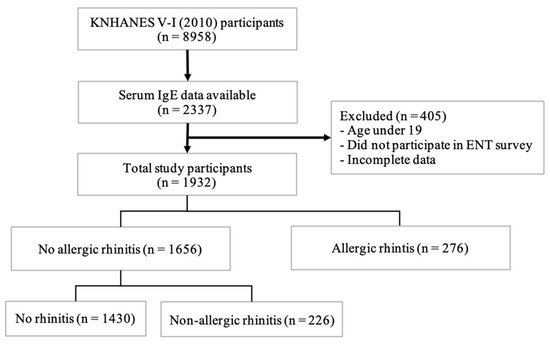 The present study used data collected by the KNHANES V-1 conducted in 2010, which was the only year in which data for serum IgE levels were collected. In particular, an otorhinolaryngology survey and endoscopic examinations were completed by 150 residents from the otorhinolaryngology departments of 47 institutes. Before participating in the survey, the residents were educated on the following: the overview of the survey; purpose of, and caution related to, the investigation of otolaryngology diseases; detailed guidance on the diagnosis and severity classification of diseases; and simulation training with the actual examination equipment. Among the 8313 subjects who participated in the otorhinolaryngology survey, 1932 were 19 years of age or older and underwent IgE testing, and thus, were included in this study (Figure 1). All participants were informed of the purpose and use of the data collected and provided written consent before beginning the survey sessions. The study was approved by the Institutional Review Board of the Korea Centers for Disease Control and Prevention (2010-02CON-21-C).