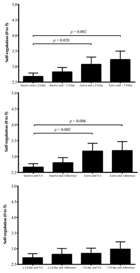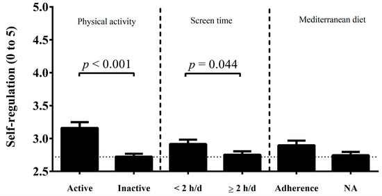 Differences in self-regulation according to physical activity, screen time, and Mediterranean Diet categories. NA, non-adherence to the Mediterranean Diet.