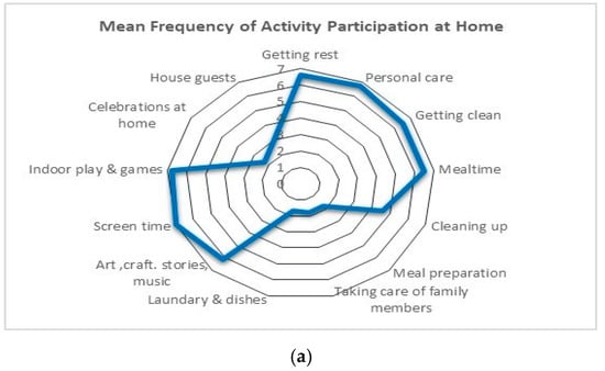 Participation: Overall, parents reported their children as participating in a variety of activities at home and in the community. Frequency and level of involvement are demonstrated in the radar graphs to depict the activities in which children engaged within the home and community settings (Figure 1 and Figure 2).
