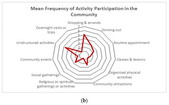 (a) Mean frequency of activity participation at home, (b) mean frequency of activity participation in the community.