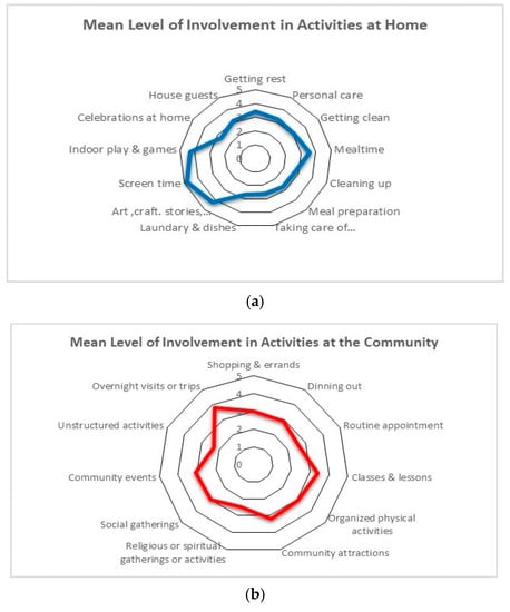 (a) Mean level of involvement in activities at home, (b) mean level of involvement in activities in the Community.