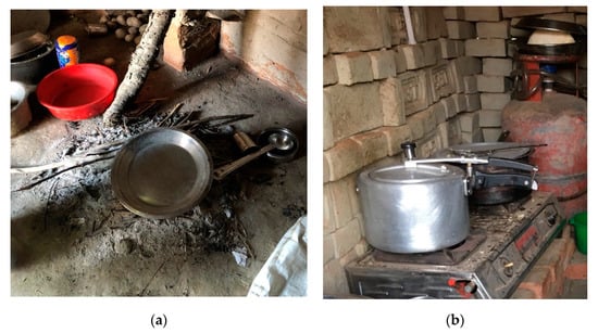 Illustrative examples of the two cooking practices observed in brick workers’ homes in Bhaktapur, Nepal: (a) indoor wood fire and (b) LPG (liquefied petroleum gas) cook stove.