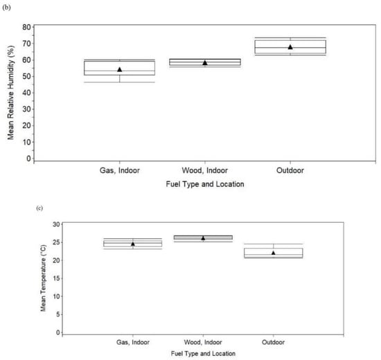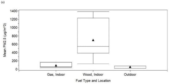 Box plots for mean PM2.5 concentration, RH, and temperature according to fuel type and location showed patterns that were similar to those just described (e.g., the distribution of mean PM2.5 concentration was higher for wood, indoor than for gas, indoor, and outdoor) (Figure 3).