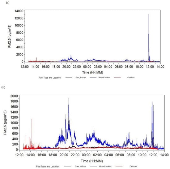 In this study, indoor PM2.5 levels for both wood and LPG fuel homes exceeded the WHO’s recommended 24 h limit of 25.0 µg/m3, but the exceedance was most pronounced for wood fuel homes. Peaks in PM2.5 appeared to coincide largely with mealtimes in wood fuel homes. For LPG homes, mealtime peaks were significantly less pronounced, and overall levels may be significantly influenced by the infiltration of ambient air pollution. Based on our findings and those of a previous study [24], LPG cookstoves appear to be used by a relatively large proportion of brick workers, suggesting that they may be a culturally appropriate alternative to wood fuel cooking. Future studies should focus on understanding barriers to LPG stove use, the potential for the adoption of clean cooking stacking, as well as interventions to decrease the use of wood fuel for cooking in this population of workers.