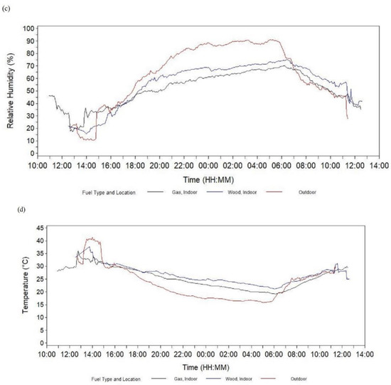 The line graph of mean (over fuel type and location categories) PM2.5 concentration over time showed increases in mean PM2.5 concentrations primarily at mealtimes, particularly in homes that burned wood indoors (Figure 4). Mean RH decreased until mid-afternoon, then increased until the morning, and then decreased again, particularly outdoors. The pattern for mean temperature was opposite to the pattern for mean RH.