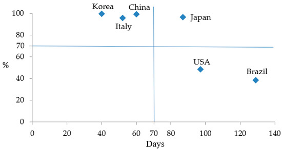 Table 2. They demonstrate that Korea had the best mitigation effectiveness by spending the shortest time of 40 days to reach the peak of new confirmed cases, while the peak had not yet occurred in Brazil. China, Japan, Italy, and the USA followed Korea, spending 60, 87, 52, and 97 days to reach the peak, respectively. As to Brazil, the number of new confirmed cases kept growing and reached a climax on the 129th day (4 July 2020). Brazil took the longest time to reach the peak and thus ranked at the bottom for mitigation effectiveness at the early stage