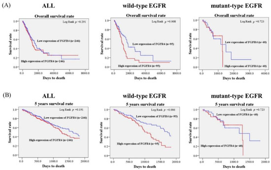 Considering the potential effects of FGFR4 expression levels in the clinicopathological characteristics in lung adenocarcinoma, we further analyzed the correlations between the FGFR4 expression level and the survival rate in 492 lung adenocarcinoma patients from The Cancer Genome Atlas (TCGA) database. In the TCGA database, 380 patients were early stage (stage I + II). A total of 163 and 24 patients were lymph node metastasis (33.1%) and distant metastasis (4.88%), respectively. As shown in Figure 1, we found that patients in wild-type EGFR lung adenocarcinoma with higher FGFR4 expression had shorter overall survival times and five-years survival times compared with those with lower FGFR4 expression (p = 0.008; Figure 1A; p = 0.006; Figure 1B). No significant differences in the FGFR4 expression and survival rates were observed in all patients with lung adenocarcinoma and in lung adenocarcinoma patients with mutant-type EGFR. Therefore, the expression level of FGFR4 may provide clinical significance for the survival rate of lung adenocarcinoma patients with wild-type EGFR.