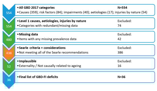 - Associated with health status: Deficits must have the potential to affect health. Hence, attributes that are not linked with health (e.g., greying hair) were not eligible for inclusion [11]. The GBD 2017 only includes items that result in poor health or cause death.