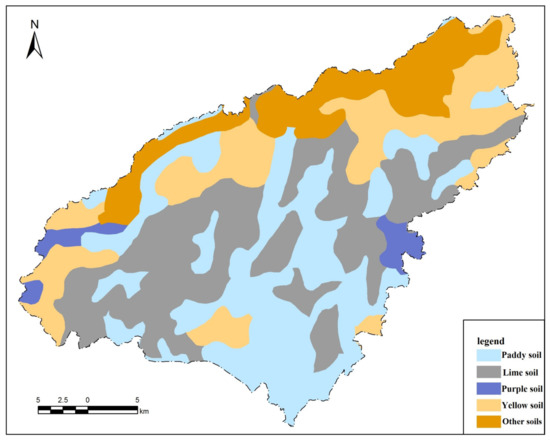 Puding County (105°27′49″–105°58′51″ E, 26°9′36″–26°31′42″ N) is located in the central part of the karst area in western Guizhou Province and east of the Yunnan–Guizhou Plateau. Puding County covers an area of 1079.93 km2, and the elevation is 1100–1600 m. Puding County experiences a northern sub-tropical humid monsoon climate. The climate is mild throughout the year, with a long frost-free period, abundant rainfall, less sunshine, and low incident radiative energy. The maximum rainfall is 1465 mm, the minimum is 891 mm, and the average annual precipitation is 1390 mm; under special conditions, the maximum temperature is 34.8 °C, the minimum temperature is −3.4 °C, and the annual average temperature for many years is 15 °C. The topography of Puding County is a typical karst landform, with a wide area of limestone distribution, strong karst development, and abundant features such as depressions, funnels, and caves. The crops are mainly rice, maize, and wheat. Certain economic crops are cultivated at the same time, including rapeseed, peanuts, and flue-cured tobacco. The soil types include moist soil, yellow soil, meadow soil, lime soil, paddy soil, and purple soil [23]. The soil types with the broadest distribution are yellow soil, lime soil and paddy soil, accounting for 37.18%, 33.24% and 27.02% of the total cultivated land area, respectively (Table 1, Figure 1).