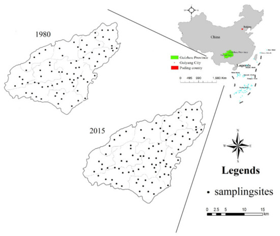 In this study, the basic information on the soil surface (0–20 cm) was mainly obtained from data for Puding County in the second national soil survey of China (1980) (the data for the SOC contents are for the depth of the A horizon) [24], and actual soil measurements of the cultivated land in Puding County were taken in the winter of 2015 (Table 2), within a period in which no rain had fallen in recent days. The sampling plots for 2015 were determined based on descriptions of sampling positions in the second national soil survey of China in 1980, employing the principle of being as consistent or close as possible. Sample collection was performed according to the S-shape route. Simultaneously, a GPS (Global Positioning System) was used to record information for each sample, such as latitude and longitude, land utilization type, topography, and sampling depth. The topsoil (0–20 cm) was collected as the soil samples. A total of 94 sampling sites were selected (Figure 2). Soil management data for the cultivated land in Puding County in 2015 were obtained from field investigation. Semi-structured interviews of typical farmers were carried out through field interviews and by referencing the county’s statistical yearbook. A semi-structured field survey was performed on the cultivated soil management inputs (data on organic fertilizer use, chemical fertilizer use, crop stubble, straw return and yields of principal crops) by the research team for several months beginning in March 2015. Stubble was mainly estimated from maize on dry land and rice in paddy fields. The application of organic fertilizer mainly involved manures and dung. Dry manure was used with straw return to the field. Chemical fertilizers used were mainly urea, compound fertilizer, and phosphate fertilizer.