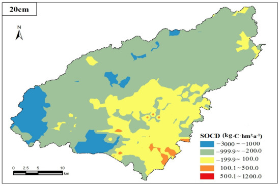 Figure 3 indicates that the average annual changes in the SOCD in the surface soil of the karst plateau showed an increasing trend in the southern, central and northern Sancha River and the surrounding Yelang Lake areas and showed a decreasing trend in most of the western, southern, small portions of central and northern areas of the county. The main reason for this difference in spatial distribution is the varying distributions of soil types. There is abundant paddy soil in the central and southern portions of the study area and the area near the Sancha River. Therefore, the advantages of paddy soil for carbon storage should be fully expressed as carbon accumulates in Puding County. Additionally, reasonable cultivated land management measures for soil types with low SOCD should be selected to improve the SOCD of the cultivated land in Puding County.
