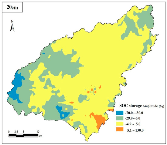 In the past 35 years, the spatial distribution difference of SOC storage in cultivated land is significant (Figure 4). The carbon loss (with the loss greater than 5%) soil is mainly concentrated in the northern, western and eastern spotted areas of the county. Carbon fixation (with the increase of greater than 5%) soil is mainly concentrated in the banks of the Sancha River, the edge of Yelang Lake, and the central and southern parts of the county. In addition, soil with relatively balanced SOC storage (variation at the range of ±5%) is mainly distributed in the southeast and most part of the central region. Soil properties are good in areas with the increase of organic carbon storage. In addition to human activity influence, human soil utility practices have a critical impact on the changes of SOC storage in the study area, especially in the aspects of fertilization, straw returning, and stubble. Field surveys and interviews suggest that stubble in paddy fields (paddy soil) is the most common activity in the study area. The application of chemical fertilizers and organic fertilizers in paddy soil is greater than that in other soil types, which is conducive to the increase of SOC storage at a certain extent. Farming conditions in areas with decreased organic carbon storage are poor and agricultural inputs are limited, causing a small variation in SOC storage and even a carbon loss. In general, it shows a very slight carbon fixation in the study area.