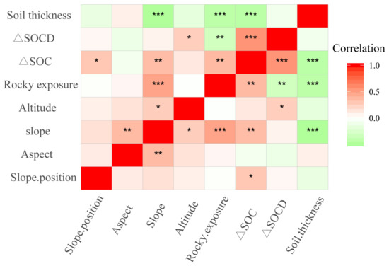 The results from the correlation analysis are presented in Figure 5. The redder the colour in a square is, the greater the relationship between the two indicators is. The Pearson correlation coefficient was used in this study to reflect the degree of linear correlation between two variables, and its value ranged from −1 to 1. When the linear relationship between the two variables increases, the correlation coefficient approaches 1 or −1. When one variable increases with another variable, there is a positive correlation between them, and the correlation coefficient is greater than 0. When one variable decreases with another variable, there is a negative correlation between them, and the correlation coefficient is less than 0. If the correlation coefficient is equal to 0, there is no linear correlation between them. As shown in Figure 4, the change in SOC was significantly positively correlated with SOCD, rock exposure and slope. The change in SOCD was significantly positively correlated with elevation. The change in SOC was significantly negatively correlated with the soil thickness, which reflects that SOC content decreases with increasing soil thickness. The value of correlation between the change in SOCD and rocky exposure was 0.001–0.01, indicating significant negative correlation.