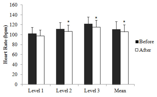 Heart rate (HR) recorded during the final seconds of Level 1, 2 and 3, and Mean HR calculated from averaged individual HR values recorded during the final seconds of Level 1, 2 and 3 of Chester Step test conducted before and after dancing intervention. Values are mean ± SD. * Significant difference (p < 0.05, paired t-test) from before.