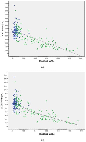 - Mani, M.S.; Kunnathully, V.; Rao, C.; Kabekkodu, S.P.; Joshi, M.B.; D’Souza, H.S. Modifying effects of δ-Aminolevulinate dehydratase polymorphism on blood lead levels and ALAD activity. Toxicol. Lett. 2018, 295, 351–356. [Google Scholar] [CrossRef] [PubMed]