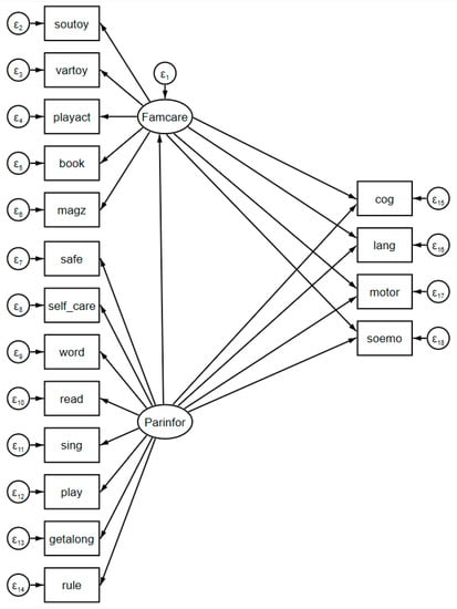 Poor family care could partly originate from the lack of parenting information. Parenting information refers to the information about positive parenting practices, that the caregivers could engage in, to help the child to reach their full development potential []. In the USA, mothers with low SES have fewer sources of parenting information, and their frequency of sharing reading with their children in infancy is lower than those with high SES []. Similarly, in rural China, many caregivers never receive the information to help them to create a stimulating home environment, so they do not know how to successfully stimulate their children’s development [,]. Furthermore, some parenting programs that delivered parenting information to caregivers in rural areas found that, in the intervention group, family care in terms of parental investments increased by 0.35–0.72 standard deviation (SD), and the child’s cognitive development increased by 0.23–0.27 SD [,]. These findings indicated that family care might mediate in the links between parenting information and child development. To date, however, the interrelationships have not yet been estimated by a structural model.