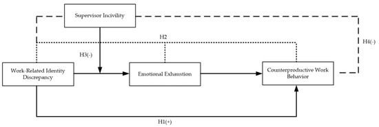 Hypothesis 1 proposes a direct effect of work-related identity discrepancy on counterproductive work behavior; Hypothesis 2 suggests a mediating effect of emotional exhaustion; and Hypothesis 3 offers a moderating effect of supervisor incivility. Following the logic of these three previous hypotheses and drawing on Hayes’ [46] recommendation on the moderated mediation effect, we set forth a moderated-mediation model as follows: