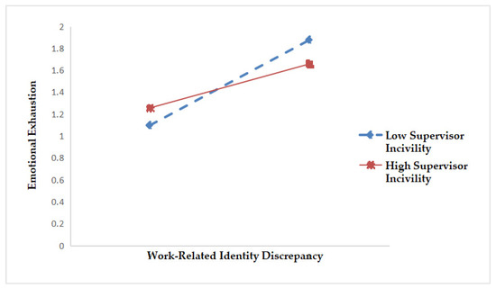 Next, we tested the moderating role of supervisor incivility. To reduce potential collinearity between work-related identity discrepancy and supervisor incivility, we decentralized all explanatory variables (except demographic variables) [56]. As shown in Table 3, work-related identity discrepancy has a significantly positive correlation with emotional exhaustion (M3, β = 0.535, p < 0.001), after entering the interaction term between work-related identity discrepancy and supervisor incivility in Model 5, and the interaction coefficient is significant (β = −0.173, p < 0.001), R2 = 0.405 (p < 0.001). These results indicate that supervisor incivility played a negative moderating role in the relationship between work-related identity discrepancy and emotional exhaustion. Therefore, Hypothesis 3 receives support. That is, when supervisor incivility is high, the positive correlation between work-related identity discrepancy and emotional exhaustion is weak. In addition, after all variables being decentralized, the effect of supervisor incivility on emotional exhaustion (M4, β = 0.596, p < 0.001) is still stronger than that of work-related identity discrepancy on emotional exhaustion (M3, β = 0.535, p < 0.001), which is consistent with our inference.
