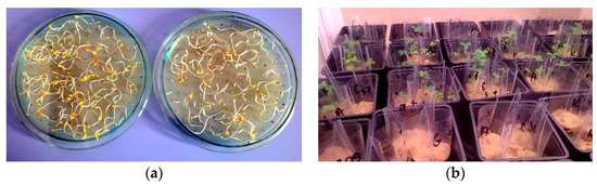 Biotest with clover: (a) growing clover sprouts on Jensen’s medium (1942) [44] before planting in sand; (b) clover growth on sand contaminated with PAH and inoculated with bacteria.