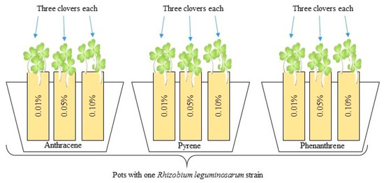 Scheme of biotest: each strain of Rhizobium leguminosarum was prepared with three pots, each containing sand contaminated with PAHs in three doses. Such pots were prepared in two repetitions—the second one was additionally co-inoculated with Azospirillum brasilense; three clovers were growing in each pot.