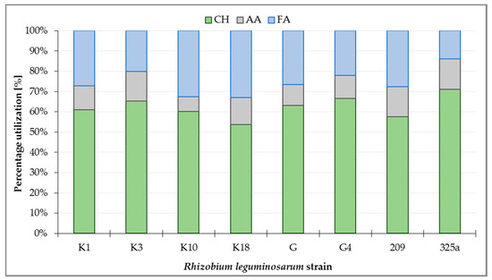 Metabolism analysis of all R. leguminosarum strains with the use of GEN III™ plates showed that carbohydrates (CH) were the most intensively utilized group of substrates, at a total level of about 63.3% (Figure 3). Analyzing the utilization of CH by R. leguminosarum strains, it can be observed that the 325a strain utilized compounds from this group the most intensively (71.05%), while the strain K18 was used the least (53.77%). Fatty acids (FA) were utilized at 13.85% (strain 325a) up to 33.01% (strain K18). The least utilized group of substrates by microorganisms were amino acids (AA), ranging from 7.28% (strain K10) to 15.11% (strain 325a, Figure 3).