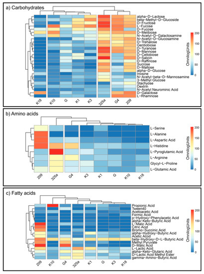 R. leguminosarum strains decomposed the individual substrates at different levels (Figure 4a–c). This indicates a large metabolic diversity of the used strains. The analysis of CH utilization (Figure 4a) allowed us to divide Rhizobium strains into four groups: (1) K18; (2) K10, G, K1, K3; (3) 325a; and (4) G4 and 209 (Figure 4a). For the G4 and 209 strains, similar distribution of compounds from this group can be observed. The 325a strain has been intensely decomposed, among others, to alpha-D-Lactose, L-Fructose, and D-Fructose. An interesting observation is the low consumption of D-Fucose by strain 209 and intensive utilization of D-Galactose by strain K18, which generally showed low metabolic activity for compounds from the carbohydrates group.