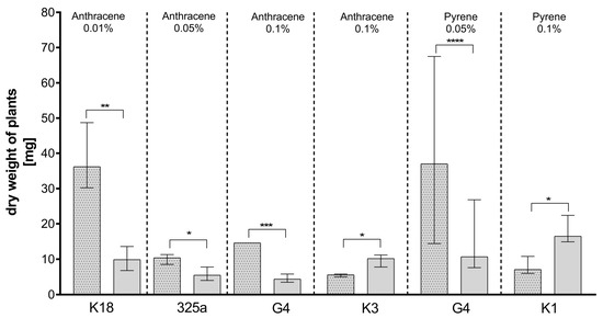 Analyzing the effect of co-inoculation on dry clover weight in the presence of anthracene contamination (Table 3a), it could be observed that at a dose of 0.01%, the dry weight of plants increased in seven out of eight cases. A slight decrease in dry weight after additional inoculation was observed with strain K3 only. At a dose of 0.05%, an increase in dry weight was also observed in seven cases after A. brasilense co-inoculation. A decrease was observed in the presence of the K10 strain. Plants inoculated with strains K10, K3, and 209 and co-inoculated with A. brasilense also showed lower dry weights on medium contaminated with 0.1% anthracene. Importantly, statistically significant differences were obtained only for four strains: K18, 325a, G4, and K3 (Figure 5). In the case of the K18 strain, in the presence of anthracene in doses of 0.01%, the addition of A. brasilense caused a statistical increase in the dry weight of plants. A statistical increase in the dry clover weight was also observed in combination of A. brasilense with the G4 and 325a strains in the presence of 0.05% and 0.1% of anthracene, respectively. Unexpectedly, with a dose of 0.1% of anthracene, the addition of A. brasilense to the K3 strain caused a statistically significant decrease in dry weight of clover.