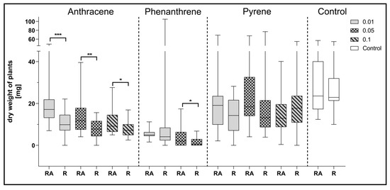 Comparison of the effect of inoculation of clover with only R. leguminosarum strains (R) and with co-inoculation with A. brasilense (RA) on average dry weight values of clover (mg). Control samples were grown without PAH. The results are presented as a boxplot with median and 2.5–97.5 percentile. The symbols indicate significant results at: * p ≤ 0.05; ** p ≤ 0.01; *** p ≤ 0.001; α = 0.05 (n = 24).