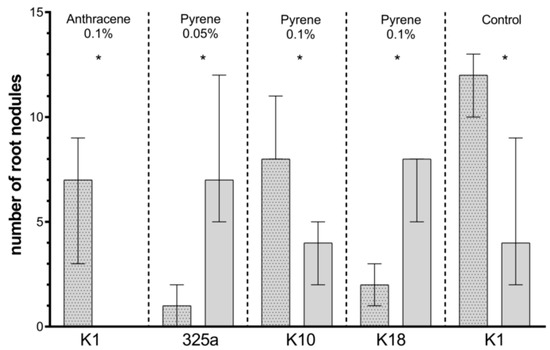 Comparing the number of root nodules obtained on clover in the presence of individual Rhizobium strains, it can be observed that the greatest variation was seen in combination with Azospirillum. In the presence of 0.05% anthracene, a statistically significantly higher number of root nodules was obtained with inoculation of a single K3 strain. In the variant with Azospirillum, the number of nodules was significantly higher in the presence of K3 (0.01%), K1 (0.05%), and 325a (0.1%) strains (Table 4a). Inoculation with 209, G, K1, and K18 strains in co-inoculation with A. brasilense had a positive effect on the number of root nodules in control samples (Table 4). However, only in the case of the K1 strain in the control, the addition of A. brasilense caused a statistical increase in the number of root nodules on clover (Figure 7).