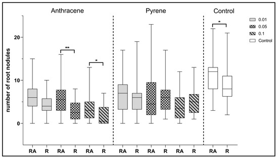 Comparison of the effect of inoculation of clover with only R. leguminosarum strains (R) and with co-inoculation with A. brasilense (RA) on the average number of root nodules. Control samples were grown without PAH. The results are presented as a boxplot with median and 2.5–97.5 percentile. The symbols indicate significant results at: * p ≤0.05; ** p ≤ 0.01; α = 0.05 (n = 24). No nodules were obtained from clover in combination with phenanthrene contamination.
