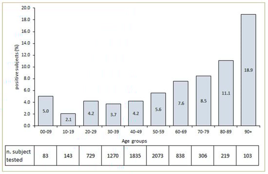 During the 8 weeks, a total of 7595 subjects were examined and tested in the Advanced Triage. A total of 395 (5.2%) patients showed positive results, and 52.5% of the total sample of patients was male. The mean age of positive subjects was 53.9 ± 18.2 years, compared to 47.6 ± 15.9 of negative subjects (p < 0.001). The number of subjects tested for SARS-CoV-2 and the percentage of positive patients attending the Advance Triage Unit according to age group is as shown in Figure 2. An amount of 286 of the 395 positive subjects (72.4%) were symptomatic and admitted to the Infectious Diseases ward.