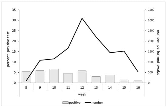 Overall, 12,822 tests were performed—approximately 228 swabs/day (276 on weekdays and 108 over the weekend). The peak of the performed tests was reached in week 12. The rate of positivity remained stable at about 6.0% until week 12, and decreased from then to arrive at 1.2% in week 16 (Figure 3).