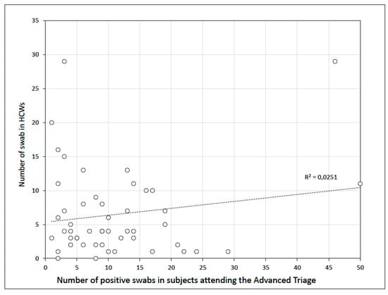 Linear regression analysis between the total positive nasopharyngeal swabs and the number of swabs performed on healthcare workers (HCWs). Each point represents a day of the period study.