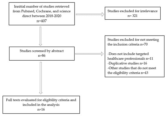 The initial studies retrieved from the databases were first selected, and studies that met the eligibility criteria, were reviewed and analyzed. Inclusion and exclusion criteria are given in Table 1. By applying these criteria, from 407 studies, 16 were included in the analysis (Figure 1). No studies were excluded because of poor quality. Although we analyzed studies between 2018–2020, two systematic reviews were included which were conducted between 2014–2020.