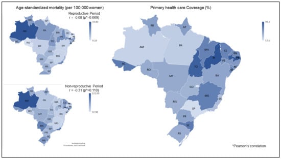 | Region/ Federative Unit | Age-Standardized Mortality (per 100,000 Women) | Primary Care Coverage (%) | ||