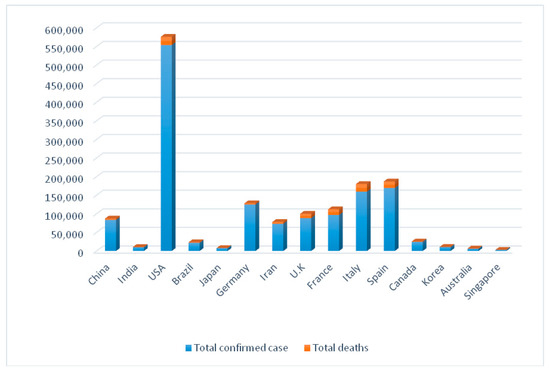 Comparison between total deaths and confirmed cases in some countries from 21 January till 14 April 2020 [10].