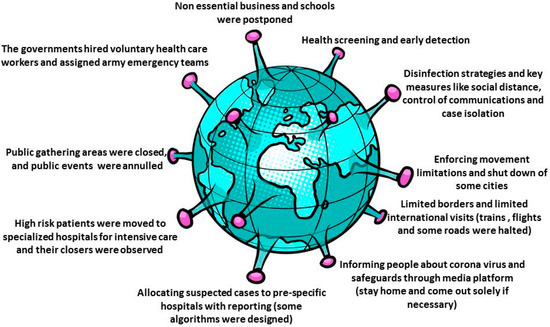 Most countries were forced to announce emergency measures to protect vulnerable people and block ways of transmission due to the continuous increase in confirmed cases by time as reported in Figure 3 [11,12,13,14,15,16]. With regard to this escalating situation, governments have begun to develop strategies to resolve the pandemic cooperatively with international health agencies, i.e., Centers of Disease Control (CDC) and World Health Organization (WHO) that declared many precautions based on previous lessons from MERS and SARS diseases, as will be outlined in this section.
