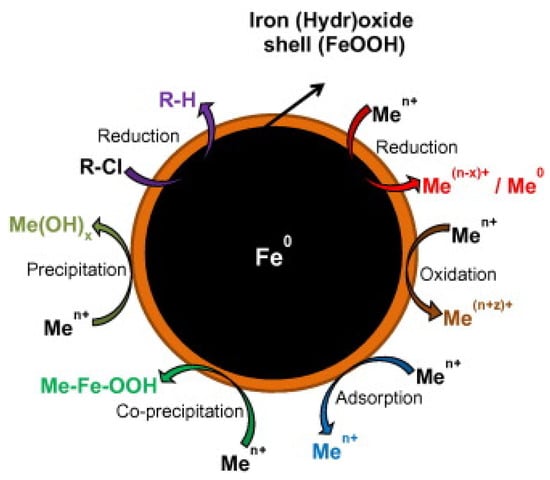 As an example, degradation of different halogenated aliphatic hydrocarbons with NZVI was carried out [] and the degradation mechanism of tetrachloroethylene (PCE), trichloroethylene (TCE), cis-dichloroethylene (cis-DCE), and trans-dichloroethylene (trans-DCE) was reported by Arnold et al. []. Nitrate concentration is also reduced in presence of bare NZVI []. Figure 1 summarized various possible mechanism for the degradation of chlorinated pollutants and metals.