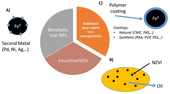 The strong attractive forces between NZVI, mainly magnetic interactions could induce the agglomeration of the nanoparticles forming micro sized aggregates, this could reduce mobility and therefore the effectiveness of the treatment [,]. This low colloidal stability is even worst under environmental condition reducing significantly their applicability []. In order to overcome these limitations and enhance their in situ performance new types of NVZI systems have been developed. Nowadays, zero-valent iron nanoparticles used for soil and groundwater remediation can be classified in three main groups (Figure 2): (A) Bimetallic iron-based nanoparticles (BNP), (B) emulsified iron nanoparticles (EZVI) and (C) polymer coated NZVI, in which the polymer increases suspension stability and particle mobility [].