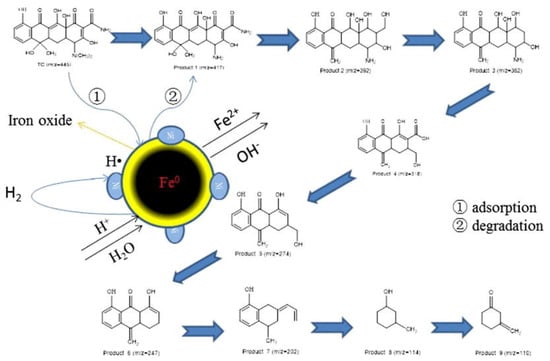 Degradation mechanism of tetracycline in presence of Fe/Ni bimetallic nanoparticles. Reproduced with permission from Dong et al. []. Copyright (2018) Elsevier.