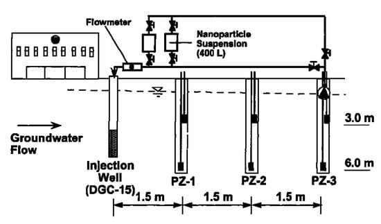 Despite the fact that most of the investigations have been carried out at the laboratory level, a few studies have indeed been performed at pilot scale or under real field conditions []. Elliot et al. carried out a field study by gravity-fed of bimetallic Fe/Pd nanoparticles into the contaminated groundwater []. Although the study presents a certain removal of TCE, the authors also reported the necessity of using higher nanoparticle concentrations and more frequent dosing pattern, in order to achieve more relevant contaminant reduction. In Figure 5, the scheme of the set-up developed by Elliot and co-worked could be observed, in which an injection point flow by three piezometers was used.