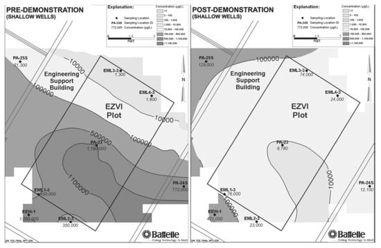 In a soil and groundwater remediation initiative developed at Cape Canaveral Air Force Station (FL, USA), O’Hara and co-workers reported and effective contaminant reductions when ENZVI was applied to DNAPL. The concentration in TCE in soil was reduced to more than 80%, whereas TCE concentration in the groundwater was reduced by 60% []. In Figure 6, the concentration contours of TCE in groundwater of shallow wells could be observed in the pre- and post-demonstration carried out on Cape Canaveral Air Force Station, Florida, showing reported reduction. Similarly, in a field test performed in an industrial site at Patrick Air Force Base (FL, USA), an initial TCE concentration of 150,000 μg/L was reduced to 3580 μg/L by a treatment with EZVI introduced by high pressure pneumatic injection [].