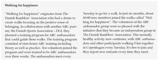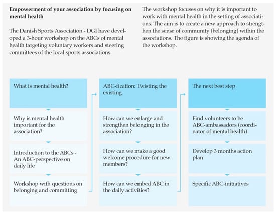 “The ABCs is in many ways a simple tool, but nevertheless a tool that needs to be contextualized and adapted depending on the audience. Many local stakeholders, service providers, and municipal partners don’t consider themselves “mental health ambassadors” although they know that their activities promote wellbeing. Also, they don’t use the words “mental health” in their everyday activities. As an ABC-coordinator you therefore need to be able to relate to the context of various local stakeholders and use words that in their setting can be translated and equal mental health such as “feeling good” and “being happy”. Sometimes that means letting go of the words “mental health” and “the ABCs of mental health” because when it comes down to it, the local stakeholders decide for themselves how the ABCs are to be used and highlighted in their activities. That doesn’t mean that they don’t do ABC-activities—just that they have adapted the messages, so they work and live in their organisation.”(Questionnaire W4, municipality 3)